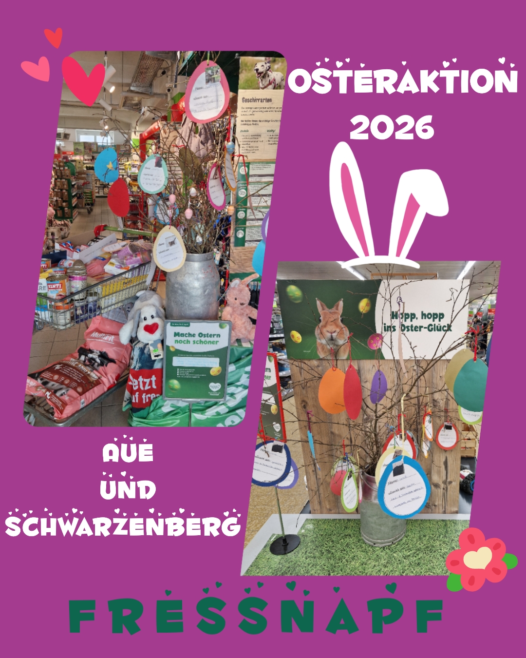 Auch in diesem Jahr dürfen wir uns wieder über die tolle Unterstützung der Filialen von Fressnapf in Aue und Schwarzenberg freuen, die uns erneut einen Platz für unsere Osterwünsche zur Verfügung stellen 🐣🌼.